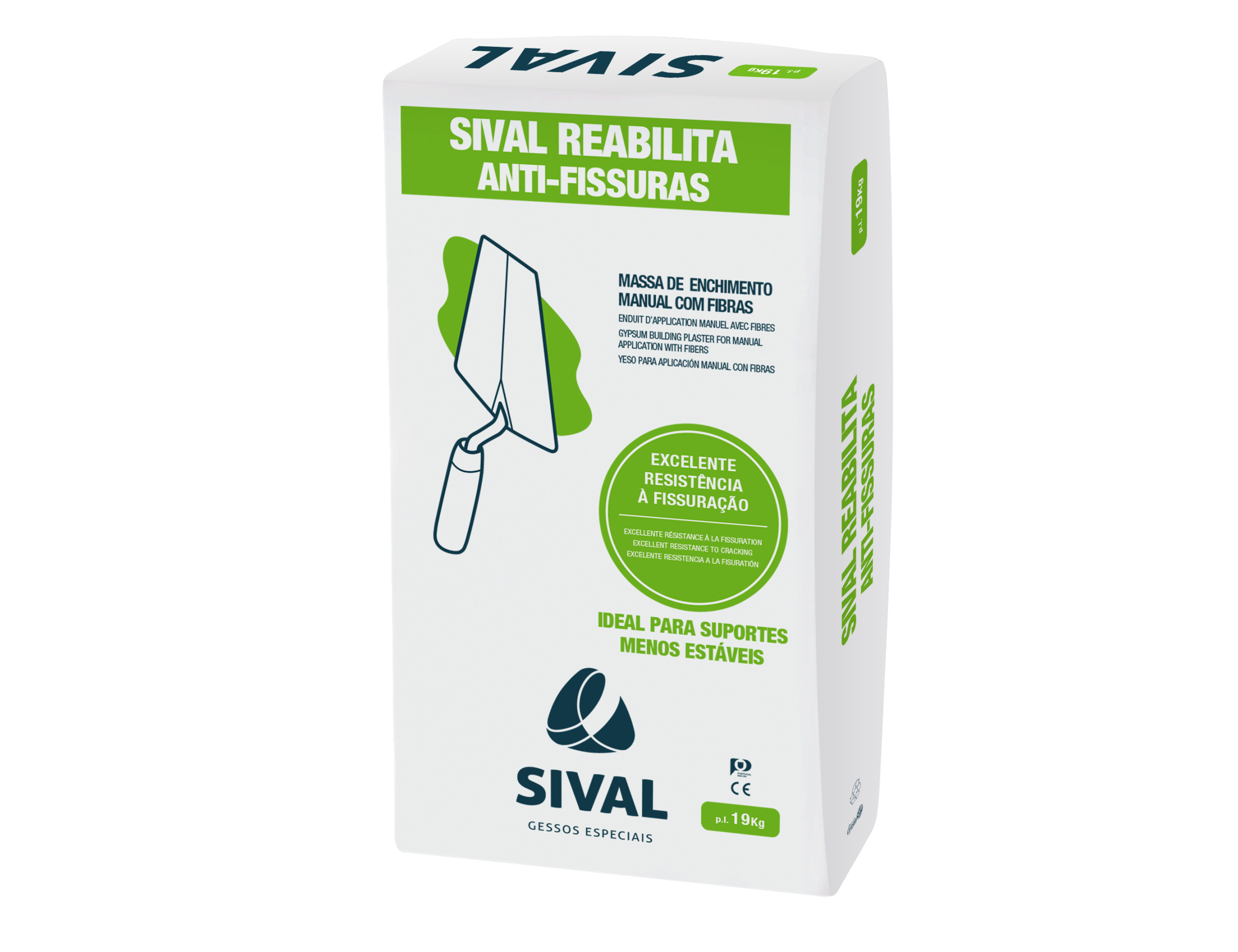 SIVAL REABILITA ANTI-FISSURAS est un produit à base de plâtre, de charges minérales, d’adjuvants et de fibres, de couleur blanche. Il est commercialisé sous forme de poudre, prête à mélanger mécaniquement avec de l’eau, pour application manuelle.